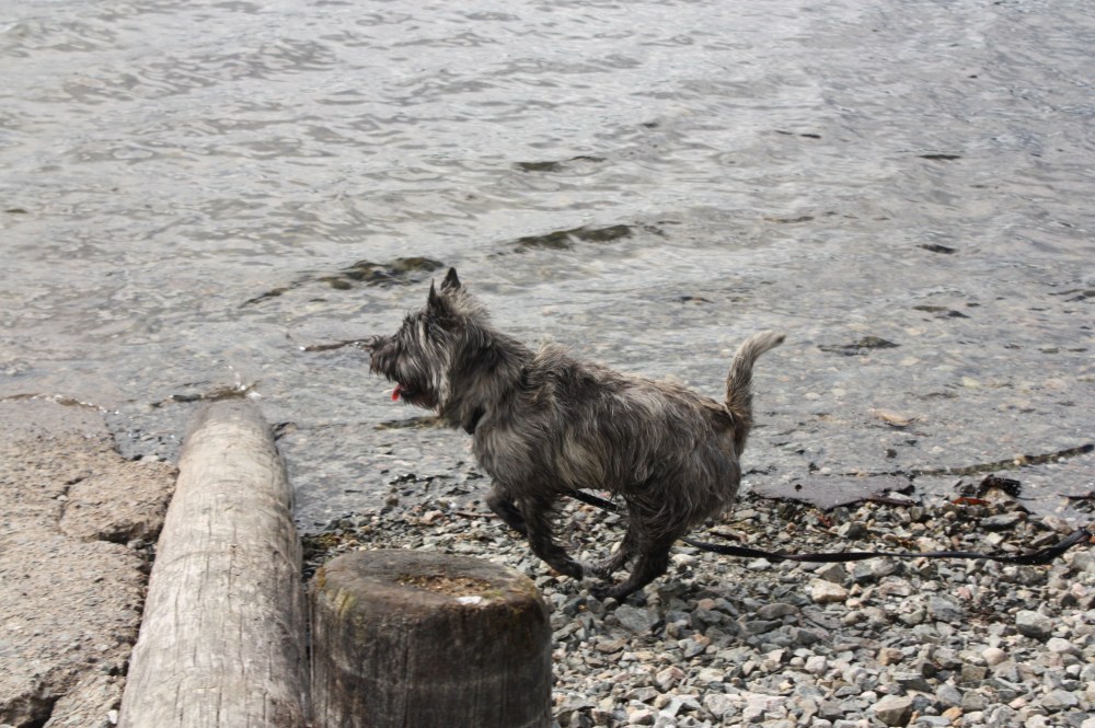 Øvelsen som fremkaller mest angst og svetteperler her er uten tvil apportering. Cairn terrier’n er ingen naturlig apporterende hund og han synes at munnen egner seg best til å spise med. Greit da – fly etter etteller annet som rører seg og holde det litt i munnen før man slipper – det er så langt hvertfall min Cairn naturlig strakk seg for endel måneder siden. Katten Freja (MarZipan) er fremdeles et yndet objekt å forsøke å få plassert innimellom tennene.. Men det har overhodet ingenting med apportering å gjøre. Det kalles middag. Jeg har prøvd sånn cirka ‘alt’ av tips og metoder jeg har fått fra diverse hundetrenere. Vi har hatt litt gjennombrudd denne uka faktisk. Han henter pinner i vann og bærer de helt til meg men slipper rett før jeg får sagt slipp. Men det som går aller best er kanskje tråd i apporten, dra den litt bortover bakken så han griper skikkelig. Da holder han den faktisk igjen når jeg drar i tråden. Han er litt slækk i kjakene idet han går mot meg så det hender han glipper den litt før jeg får sagt slipp. Men det er en start. Jeg greier enda ikke å få han til å sitte før han avleverer. Men han syns det er gøy og det er bra!