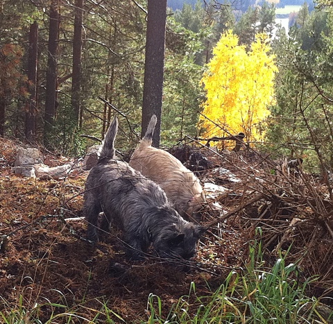 Etter å ha trent litt på ‘ruta’ med Emil til morran idag, tok vi med begge bikkjene til Bikkjebu for å trene litt spor og gå tur. Vel, der var det så fint vær at det ble laaaang start-kaffe før vi kom igang – men veldig greit å få tips fra de som kan dette med sportrening. Ronja har sannsynligvis aldri vært på sånn trening, så jeg tenker at det er smart å starte riktig. Da Emil skulle lære å gå spor, startet jeg med slepespor – dvs han så på at jeg dro leken hans uti skogen, og ble så sendt avsted etter. Dette førte til at han nå hiver seg avgårde i sporet så mose og kvister fyker – og sjansene for å misse pinner da er svært nærliggende for unge Emilsen. Og ja, det haaar skjedd *kremt* .