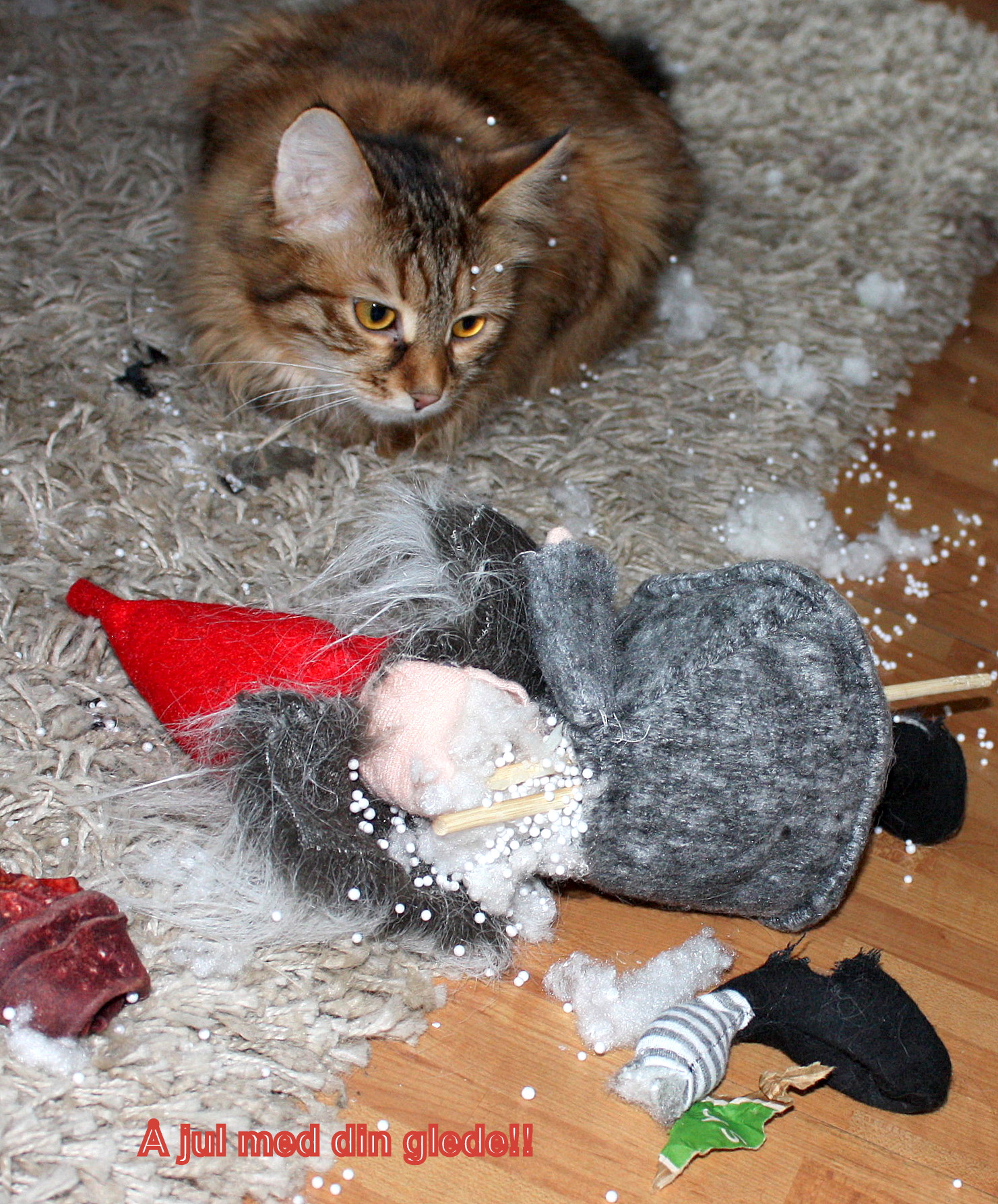 Igår våknet jeg vet ett tiden på dagen etter å ha sovet etter nattejobb. Alle gulv hadde små hvite kuler utover, i senga var det små hvite kuler og alle dyr var dekket av de samme små, hvite kulene. Etterhvert skjønte jeg at dette var levninger etter j(k)ulenissen! Bildet under taler vel for seg.