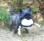 sistgang og konstatere at Emilsen muligens var blitt flinkere til å levere løsbittet – men at det fremdeles manglet litt sikkerhet i holdinga. Så da ble det opp til meg å trene apport og hold og slikt utenom skogen. Sølenstua har en kjempesvær treningsbane for hund. Jeg satt Emilsen i ene enden, løp tvers over, slapp løsbittet midt på banen og kalte Cairnterroren inn når jeg var i andre enden. Og tror’ukke han beinfløy rett til løsbittet, plukket det og tviholdt det helt til han kom fram til meg i andre enden? Selv om jeg løp motsatt vei, slik at han måtte ta meg igjen for å få levert det – ja, så fungerte det.