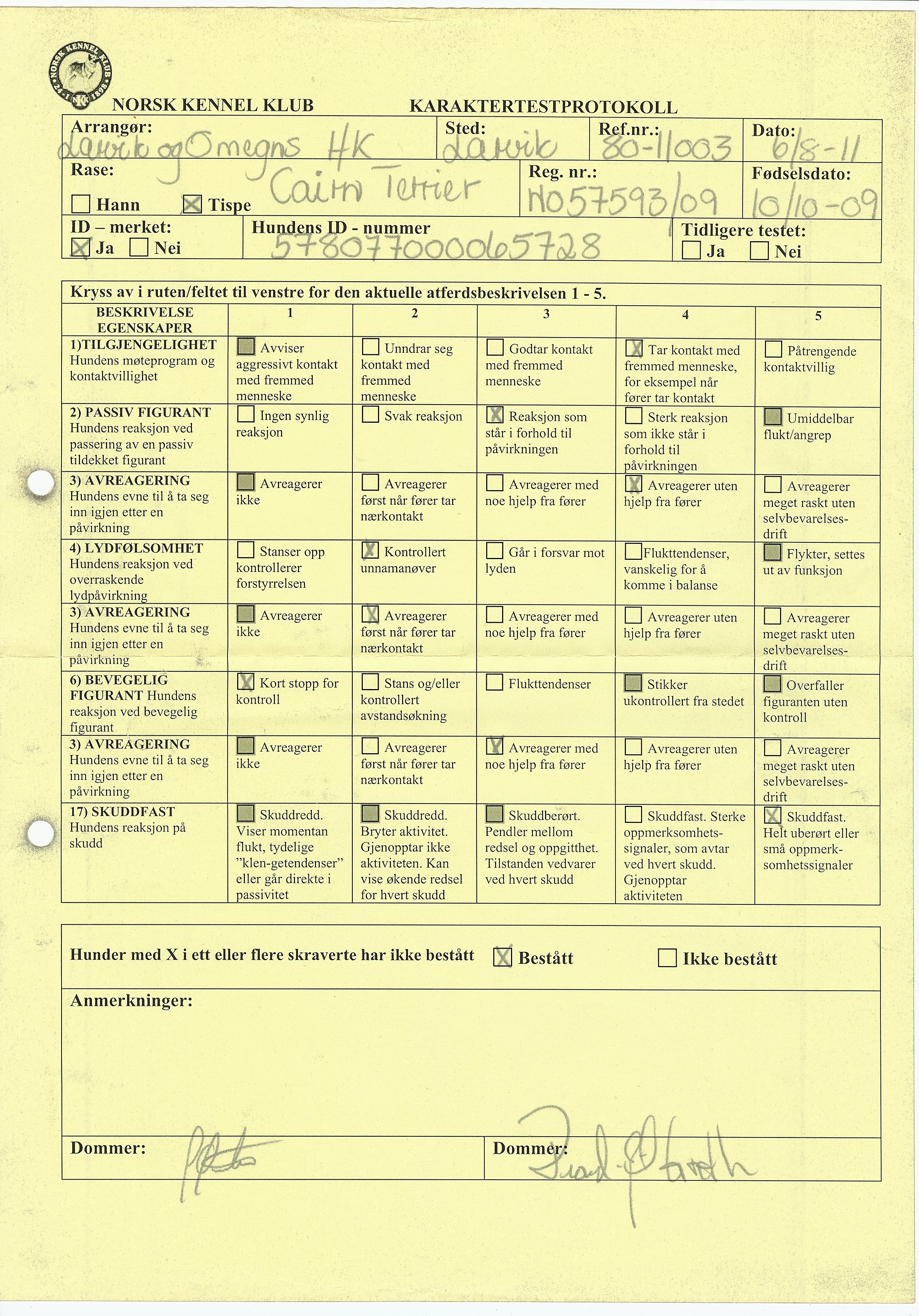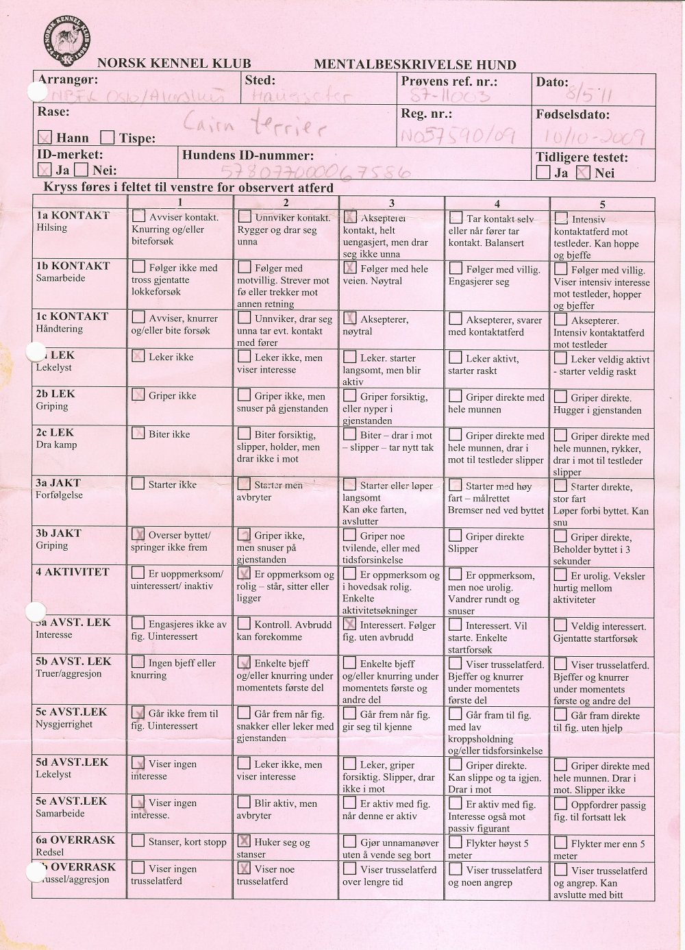 Da har begge Cairn Terror’ne fått testet hodet sitt og jeg har nå papir på at de er skuddfaste og ikke så altfor frynsete i nervene.. En mentaltest eller liknende er krav for å delta i brukskonkurranse og det er jo og en morsom måte å bli kjent med sin hund på.
