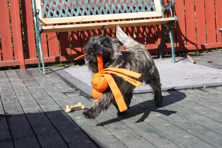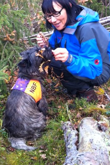 Emil er blitt bedre i spor nå. Han faller ikke ut om den Livsfarlige Hakkespetten dukker opp og han synes det er morro å komme til slutten. Han plukker gjerne pinner i sporet og innimellom leverer han og andre ting som måtte befinne seg der. Men det som virkelig er dødskult, er å beinfly ut i skauen og finne folk! For de har pølser og er spennende! Rundering. En kjempemorsom aktivitet der han skal melde funn til meg. Mye å lære og hele tiden noe å jobbe med. Greia vår akkurat nå, er at han slipper løsbittet iløpet av de siste meterne innimellom. Så vi driver fælt med meldingstrening. Det kan virke som om han glemmer at han har noe i munnen når han skal lokalisere meg for å levere løsbittet. Vi HAR jo ikke apporterende fuglehund! Vi har Cairn som er mest opptatt av at munnen er til å spise med…