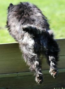 Vi hadde altså et bra utgangspunkt før lydighetsprogrammet og det er lett å bli litt skjelven da…. Og det var vel det jeg ble.. For jeg glemte endel ting. Jeg glemte å ikke se på han under lineføring, jeg glemte at 3 kommandoer under Gå forrrrran! ikke er lov…. og litt sånn. Men summa summarum så nullet vi kun på hinder i tillegg til nevnte Gååå Fååårran! og hva hinderet angår så oppsto det vanlige problemet; Han hopper fint fram og langt fremover, men han setter seg klint inntil hinderet slik at det ikke er mulig å hoppe tilbake uten å tuche. Dette finnes det en kur for og han er satt på den kuren nå. (Tjuvstart på apporten tenker jeg ikke så veldig hardt på…)