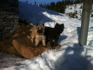 Ronja fikk litt mindre trening enn Emil da, men hun er da også samboern min sitt treningsprosjekt. De ligger fint i dekk på 30 skritts avstand i 4 minutter. Og de sitter fint om jeg går ifra med samme avstanden. Begge disse øvelsene må generaliseres og dekken må bli litt lengre. Men vi er greit i rute.