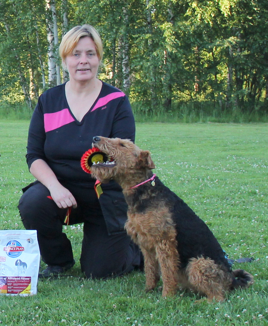oppdager at det er mengder av mygg. Skrekk og gru! Ingen reaksjon på det. Snur seg bittelitt idet jeg går bak henne – 9.5p. *Lineføring: Kjempegod kontakt! Hun følger fint på samme sted. En holdt blir hun stående og høyrevendingene er litt ruskete.. 8.0p. *Dekk fra holdt: Et lite pip ved neddekk mulig skjev ligg. 8.5p. *Innkalling: Sitter fokusert og kommer med flott fart! Litt hopping i innsitten og er innom hånd mi. 8.5p. *Stå under marsj: Stopper fint. Litt skjevt. Står stødig på tilbakeveien men snur litt på hodet i det jeg passerer. 8.5p. *Hinder: Svært fokusert. Kjapt og høyt hopp. Liten touch og litt hopp på inn – sitt. 9p. *Avstand: Flotte momenter. Helt rett. Mister 10’er her fordi hun går litt i jakt på neddekken og blir liggende 1 cm over bakken. Bittelitt treg oppsitt – igjen pga jakta. Klaskedekk ned igjen. 9.5p. *Helhet: Dommer sier at hun liker hunder med attitude, fart og litt frekkhet. Helt på nett gjennom hele programmet og elsker det vi gjør. 9p!!! Det aller mest gledelige! Totalt 177.5p, opprykk og 3plass. Det var tett i toppen, det skilte 3p til førsteplassen.