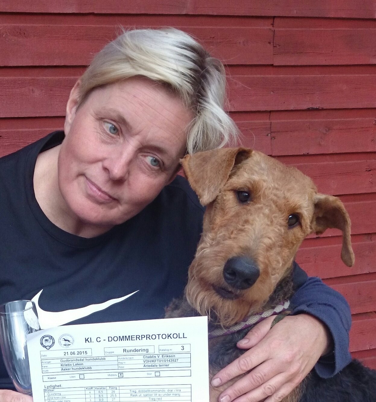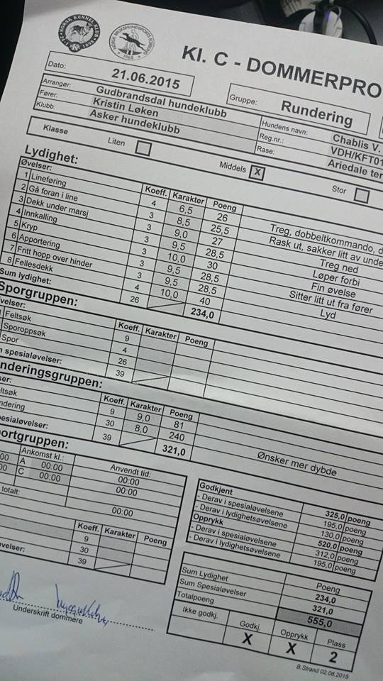 Ånei! Jeg trekker nr 1! Ånei! Jeg ramler ut på lineføringa! Hvor blir det av min venn Stevnemonster? Jeg puster ut, kikker ikke på karakteren, glemmer hele greia og fokuserer på at kommandanten her i Gudbrandsdalen jaggu er ei flink jente. Nå kommer det vi kan: Forangående i line: Vi har trent mye på rolig tempo foran. Det går fint, men ble litt for rolig bare: 8,5p. Dekk under marsj: Flott fot, rask reaksjon. Trekkes kun for treg ned siste del av dekken: 9p. Innkalling: Kanonfart og kjapp start. Litt for stor bue ved innsitten: 9,5p (Fader og jeg har trent på at hun ikke skal bremse farta med kneet mitt..) Kryp: 10p!!!!! Dommeren mumlet at: ‘Dette var denna terriern jaggu god på!’ Takk til Gro for tips om å gå ordentlig men ikke løfte beina så mye. Apportering: 9,5p. Jadda, vi kan dette! 0,5p trekk for posisjon litt langt ut fra fører. Hinder: 55 cm er for ChaBlis som en terskel å regne og hun pleier kun å gidde å slepe seg over med touch og alt. Endelig skikkelig fart og høyt hopp. Men et bjeff. 9.5p! Også: Fellesdekken som alt står og faller på og som kun har fungert en gang før i konkurranse… ! Ups, feil tankegang – ref Monica Wikstrøm. Fokus ble da dagen før da hun lå som en prest og sånn ble det seendes ut idag og 🙂 Jaaaa vi har greid kravet i lydighet med margin på 29p!