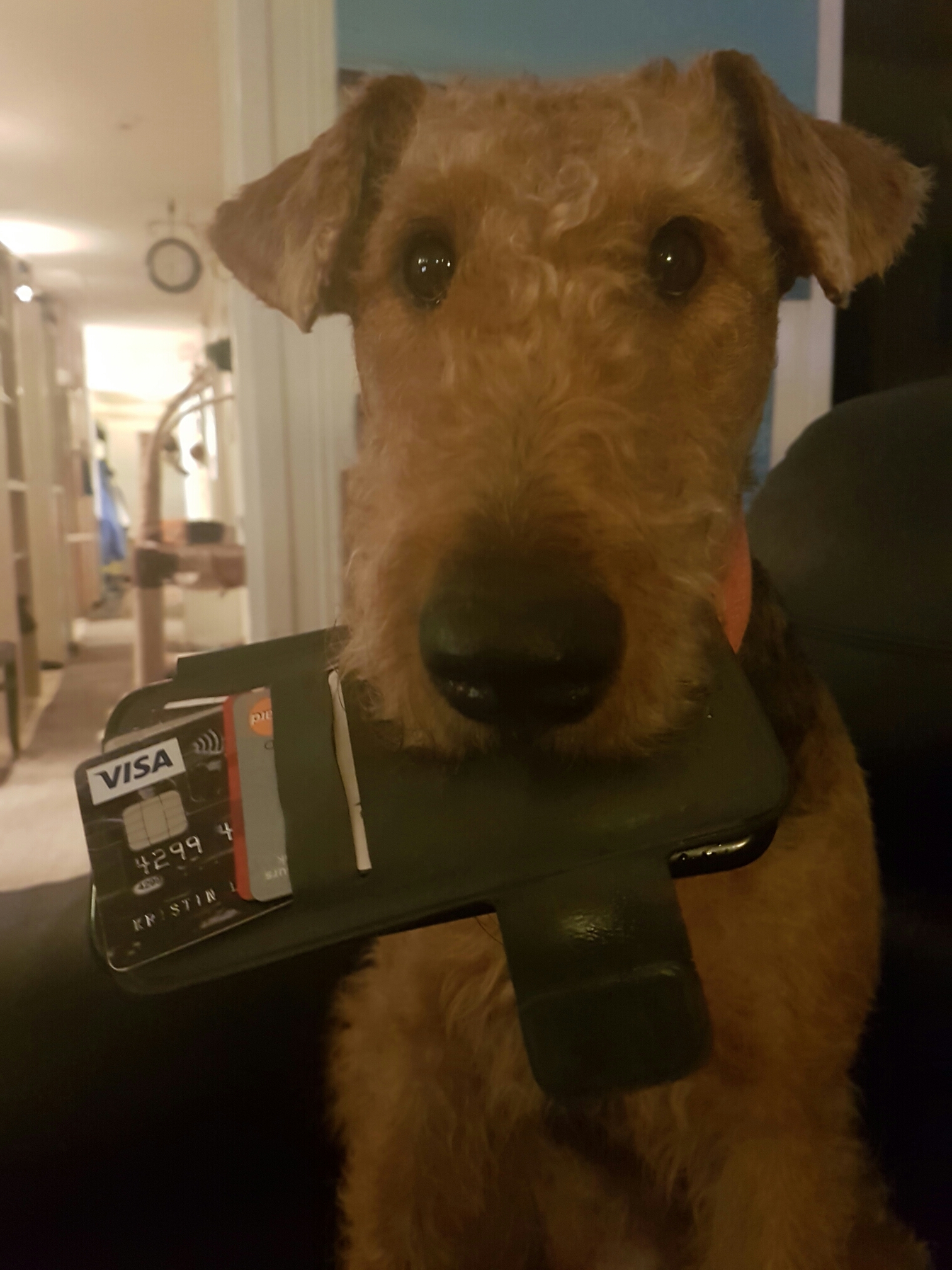 Vi nærmer oss der vi har parkert bilen og er, bortsett fra en liten sløyfe inn i terrenget, bokstavelig talt tilbake til start. Jeg er lettere nedstemt og konstaterer at jeg ikke aner hva jeg skal i morgen engang. Alt ligger på den telefonen. Faktisk er vi bare 100m fra der vi startet. Jeg sender the Bjeffert ut på siste sløyfa. Hun styrter av sted! Langt innover. Og kommer kjapt og gledestrålende hoppende ut av skogen med mobilen min dinglende i munnen! Utrolig!