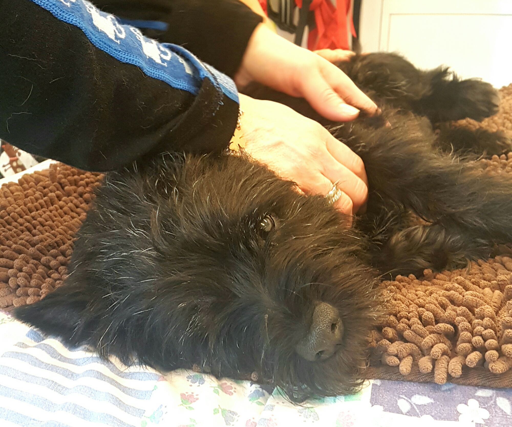 ‘Så mange hender, så liten tid..’ Ikke en muskelknute slapp unna i går på CoolDog. Tror nok Emil vurderte adresseendring på stedet… Katja Petrell hadde nemlig besøk av en annen ‘sånn som seg’ fra Søgne Fysioterapi. Slik at begge bikkjene fikk dobbel dose. Massasje både foran og bak. Samtidig. Ikke så ille å være korsbåndskadet Cairn med løse skruer da.