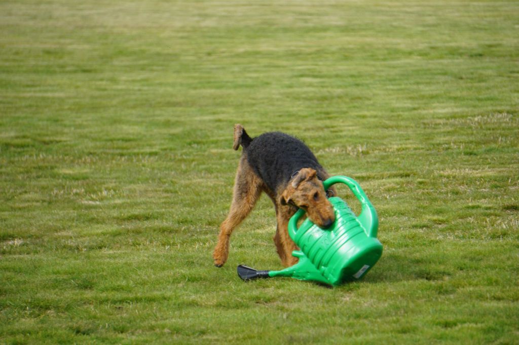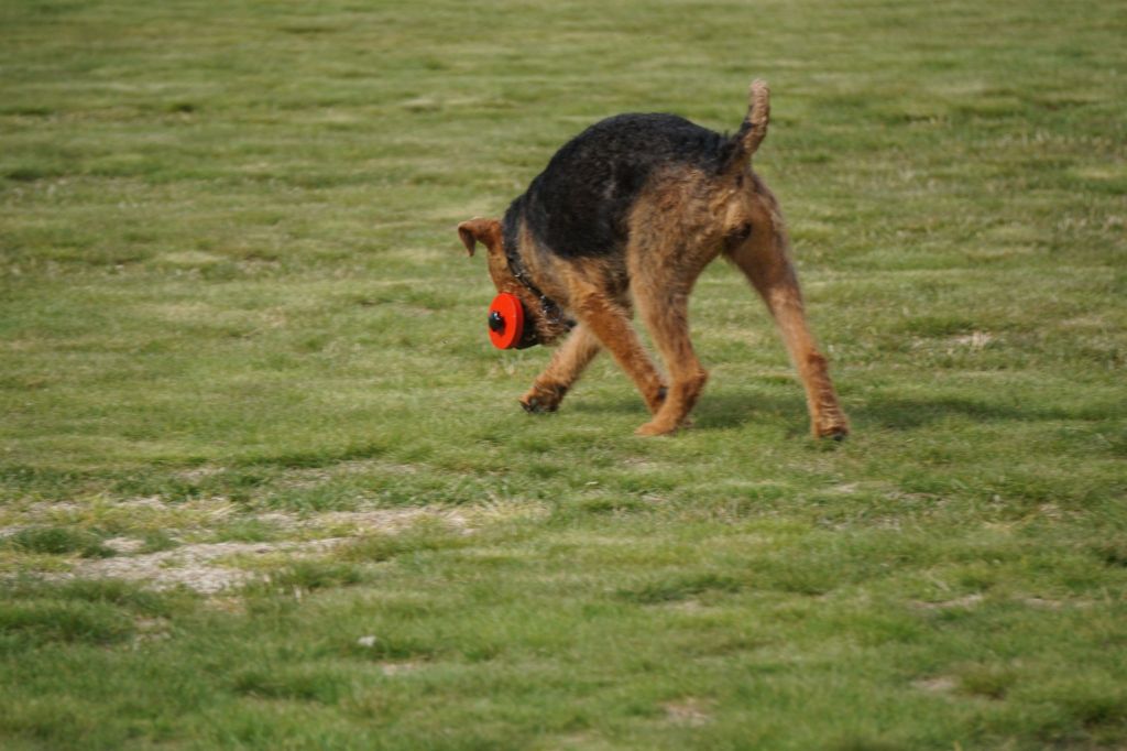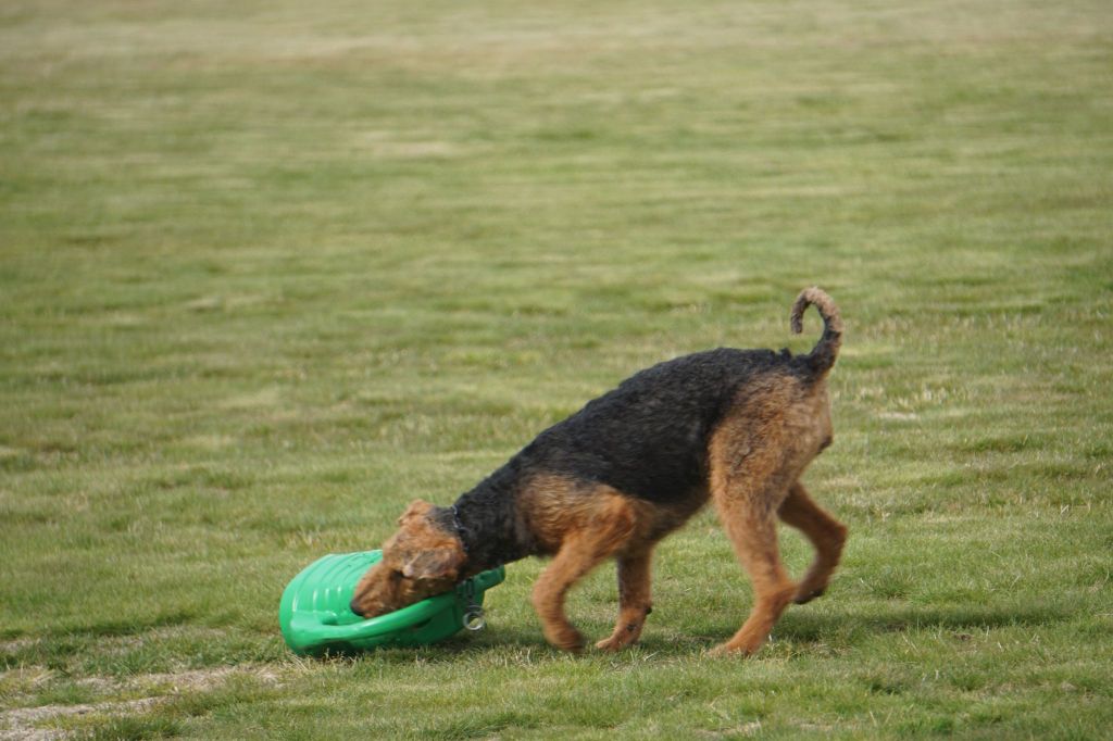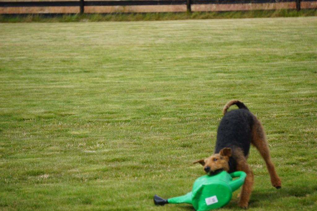 ChaBlis var i fin modus og raste rett ut. Gjennom buskene, bak til linja og fulgte den helt til høyre.. For der lå en svær lekefisk! En som var større en en fotball og med pels.. Jeg tror den peip også.. Guuuuuud den ble hentet, drept og ristet og kastet opp i lufta. Men mirakuløst nok avlevert, kun med små protester. Så dro hun ut igjen og kom inn med den på forhånd fryktede lekeslangen. Fin avlevering, Men da – ble hun borte en god stund. Så kom en smokk. Og rett etterpå en ladekabel av type small. Så en smal tøyremse. Og en strips. Ristet og tygd og det var skjevt avlevert. Også – ble det løpt endel – også gikk tida ut… Så vi endte opp med 6 av 8 gjenstander.
