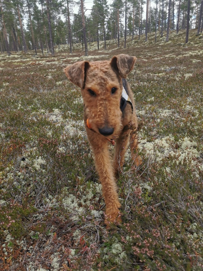 Nydelig melding og påvis. Og sånn fortsatte det. Hun jobbet litt på egenhånd ved å søke 15 meter utenfor midtlinja og hun dro langt ut på slag når jeg ba henne om det. Jeg så at hun hang seg opp et par steder, men lot være å få panikk for det, og lot henne utrede ferdig. Etterhver så hadde vi tre funn.. Blandt annet en ganske så liten tøybit som lå helt nede på stammen på et tre i en myr. Det gikk en stund og vips! var funn nr fire gjordt! En liten støvel, hengt en meter over bakken bak et tre. Det er så godt gjort det! For en følelse. Endelig lykkes vi, uten surr. Tiden ble 35 minutter, ikke værst på en rolig 1000m rundering en tidlig fredags morgen.
