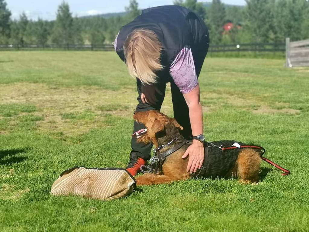 Men Quinny da! Quinny trasla seg gjennom sporet sitt i relativt høyt gress og heftig vind. Gikk over en gjenstand, men det holdt likevel til 78 poeng. I lydigheten var Quinny mer på enn sist, og drev kun med dekk øvelser et par ganger. Det har nemlig vært sånn at hun har lagt inn dekk rett som det er helt umotivert. Jeg aner ikke hvorfor, men tenker at det kommer an på trening da. I gruppe C var Quinny nesten like rå som sin tante som ikke er tante og kasserte inn hele 92 poeng. Og dermed ble Quinny Airedale nummer to med IGP1 tittel i Norge.