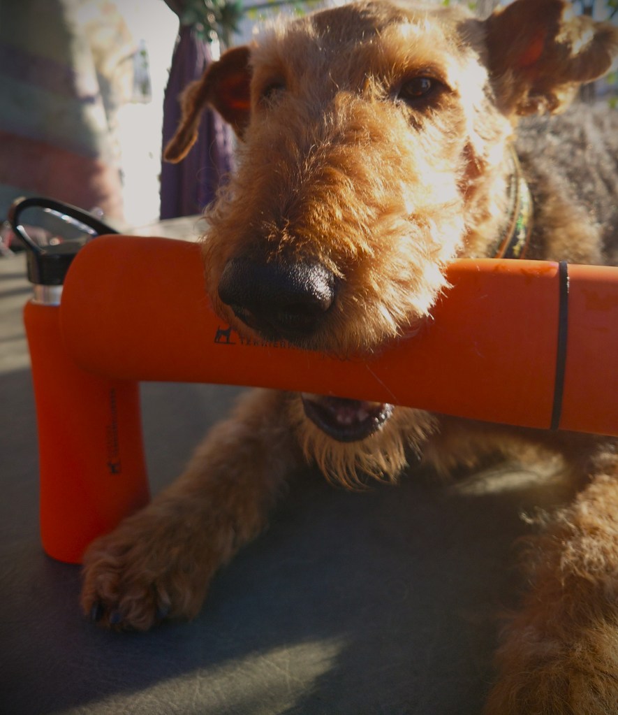 Ja, for jeg må si at de årene jeg har vært medlem med Airedalene mine av raseklubber her i Norge, så er det jaggu ikke mye til oppmerksomhet man får. ChaBlis har oppnådd mange ting i kategorien ‘første Airedale’ – feks tre ganger godkjent redningshund, første med IGP1 og IBGH3, mange år i NBF klasse A – begge grener, faktisk og har hun kommet seg opp i LP3 i lydighet. Noe er lenge siden og noe er ganske nylig. Men jeg har vel ikke fått så mye som et gratulerer i posten. Men fra Sverige har det kommet små pokaler, et stort hundebur, diplomer osv og nå sist – en termos og en drikkekopp med logo. Stas.