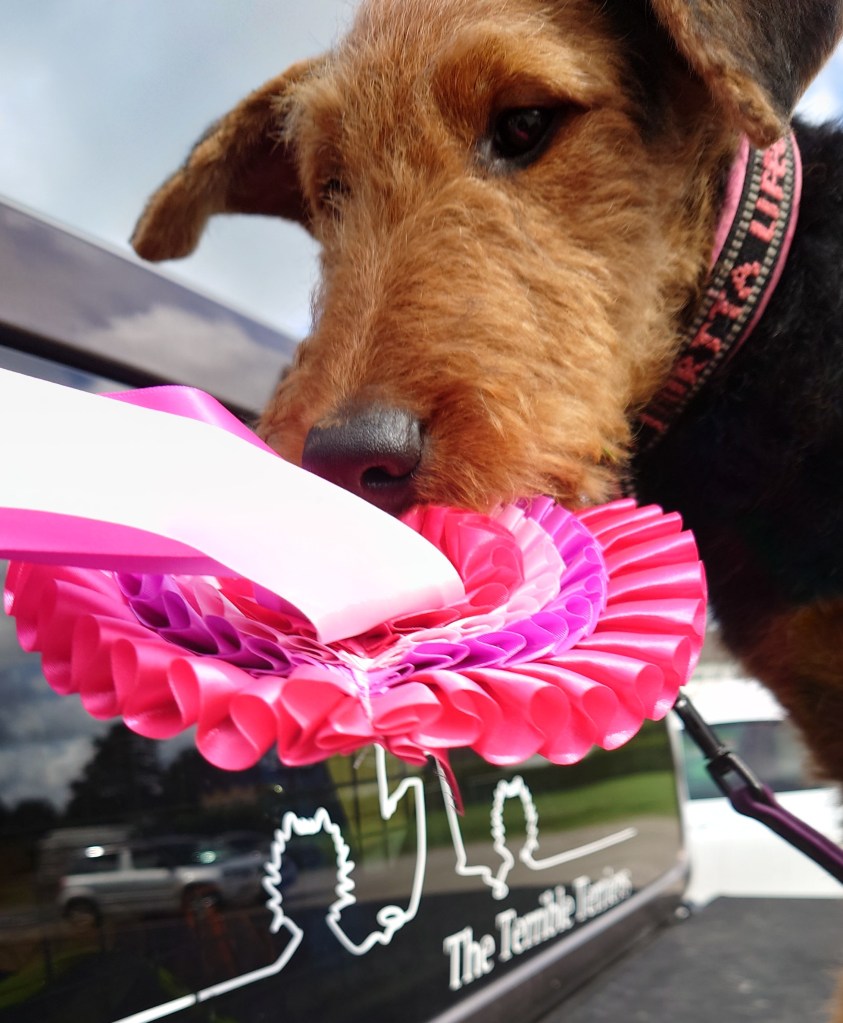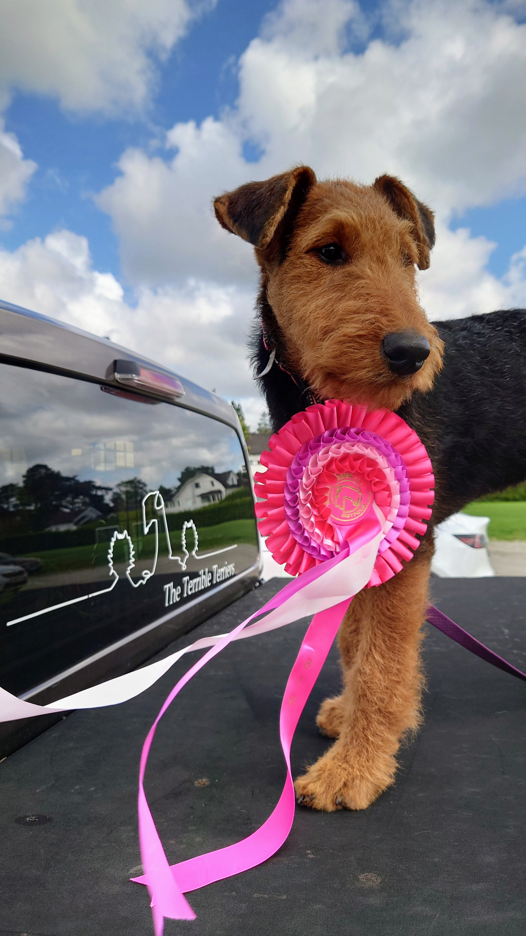 Litt gøy at det ble debut i den grenen vi sånn egentlig hadde tenkt å drive minst med. Men det var masse andre terriere og folk der, og det ble litt av en utfordring å buksere disse to noenlunde urørte fram til ringen.