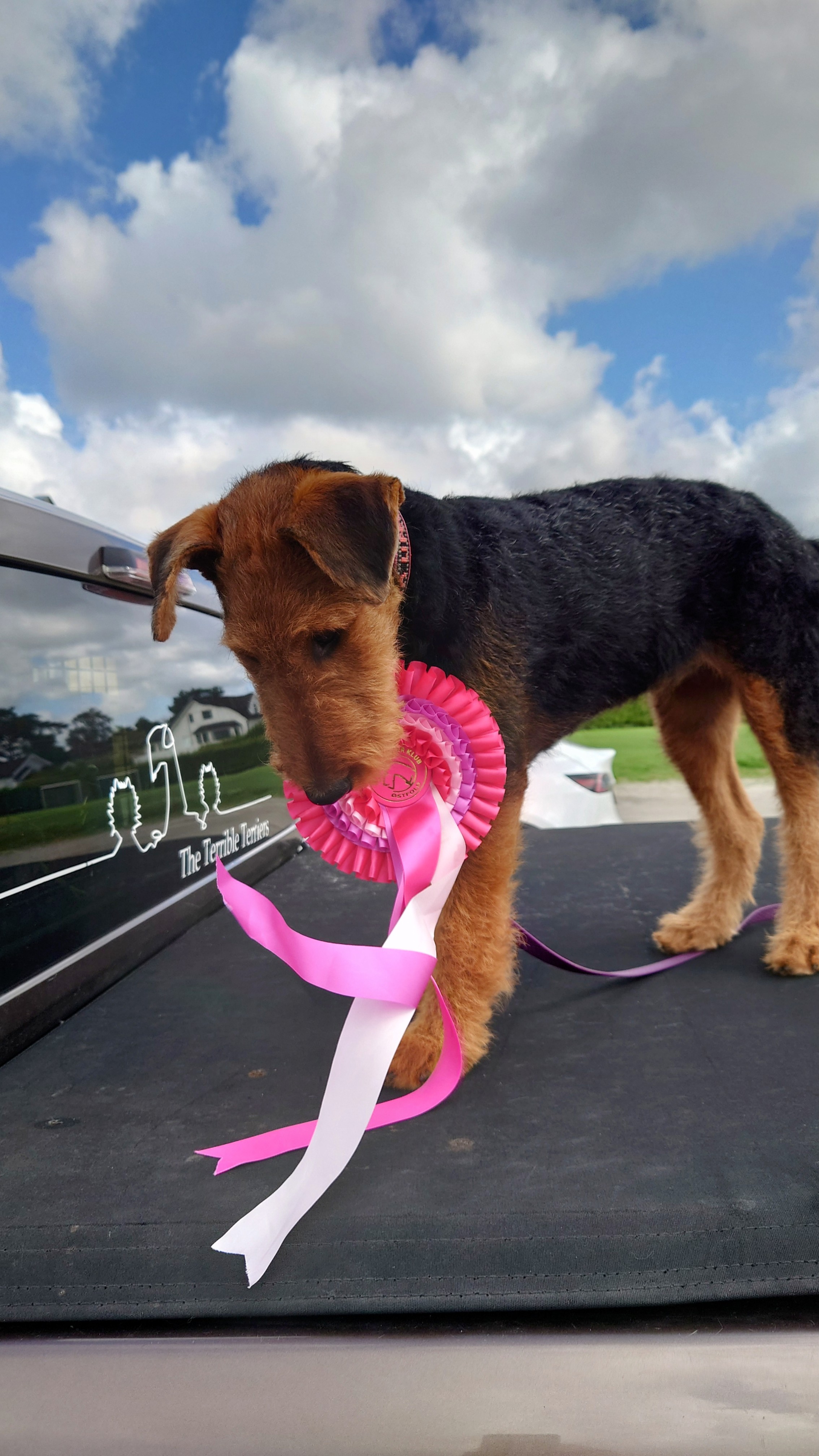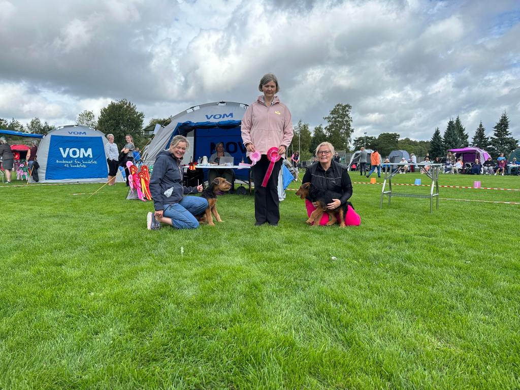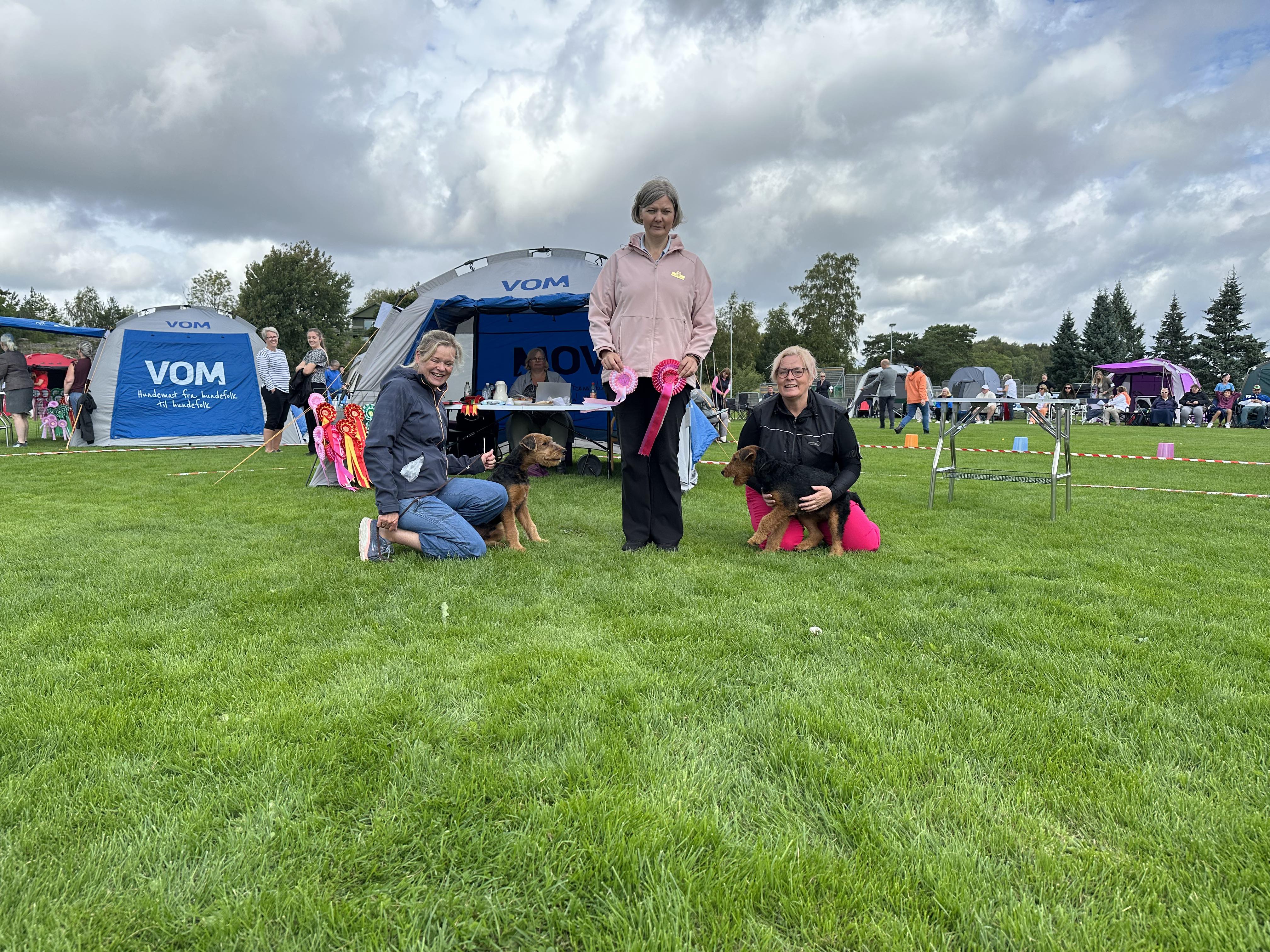 30.juli var valpene akkurat over fire måneder. Det er aldersgrensen for valpeshow. Med stor trang til å gjøre noe med valpene, møtte Anne Grete og jeg opp med hvert vårt vidunder i tynn tråd, da Terrierklubben hadde sin utstilling i Sarpsborg. Agenda og Atlas Scott skulle debutere i utstillingsringen.