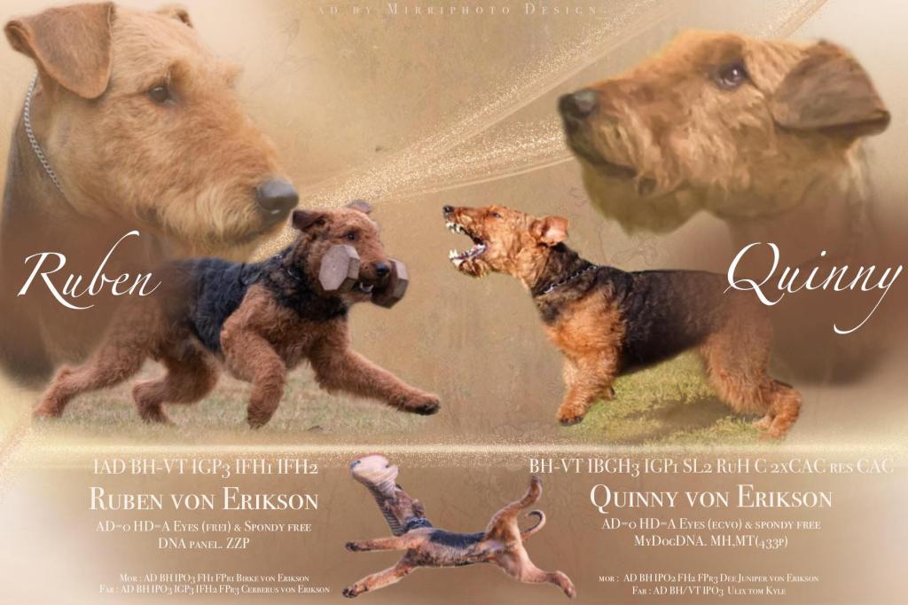 Airedale von Erikson in Germany has around 40 years of experience in mental breeding (German: Leistungssucht) on the Airedale Terrier, and very few others have that kind of experionce. To know what to mix to preserve the Airedale Terrier’s exceptional usability is in itself a science. Something I leave to the experts. Everyone in the family is highly titled and meritorious working dogs. Both the breeders in Germany and I compete and train the breeding dogs.